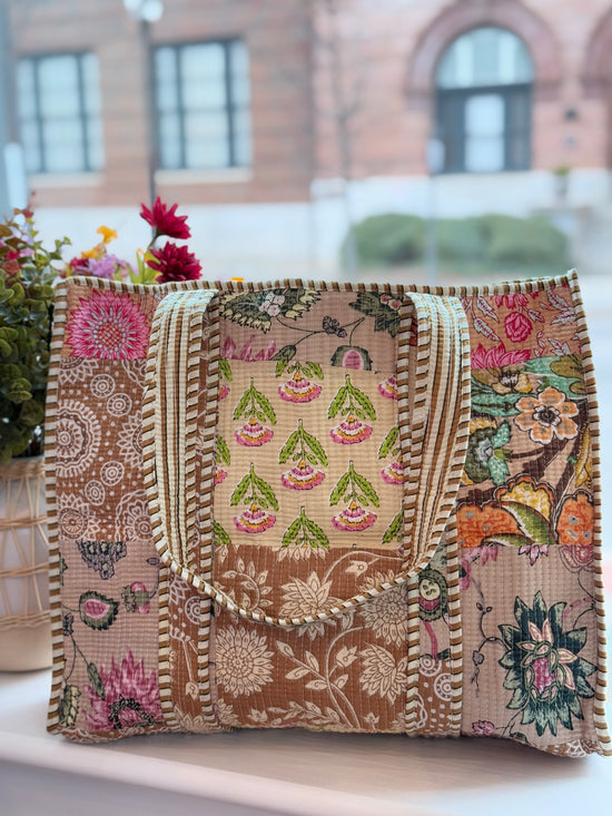 Shop our variety of bags here!All of our quilted bags are handmade in India by a woman owned company that all provide for their families. We love to see women doing the dang thing. All of our bags are machine washable, reversible, and can be used for literally any occasion.