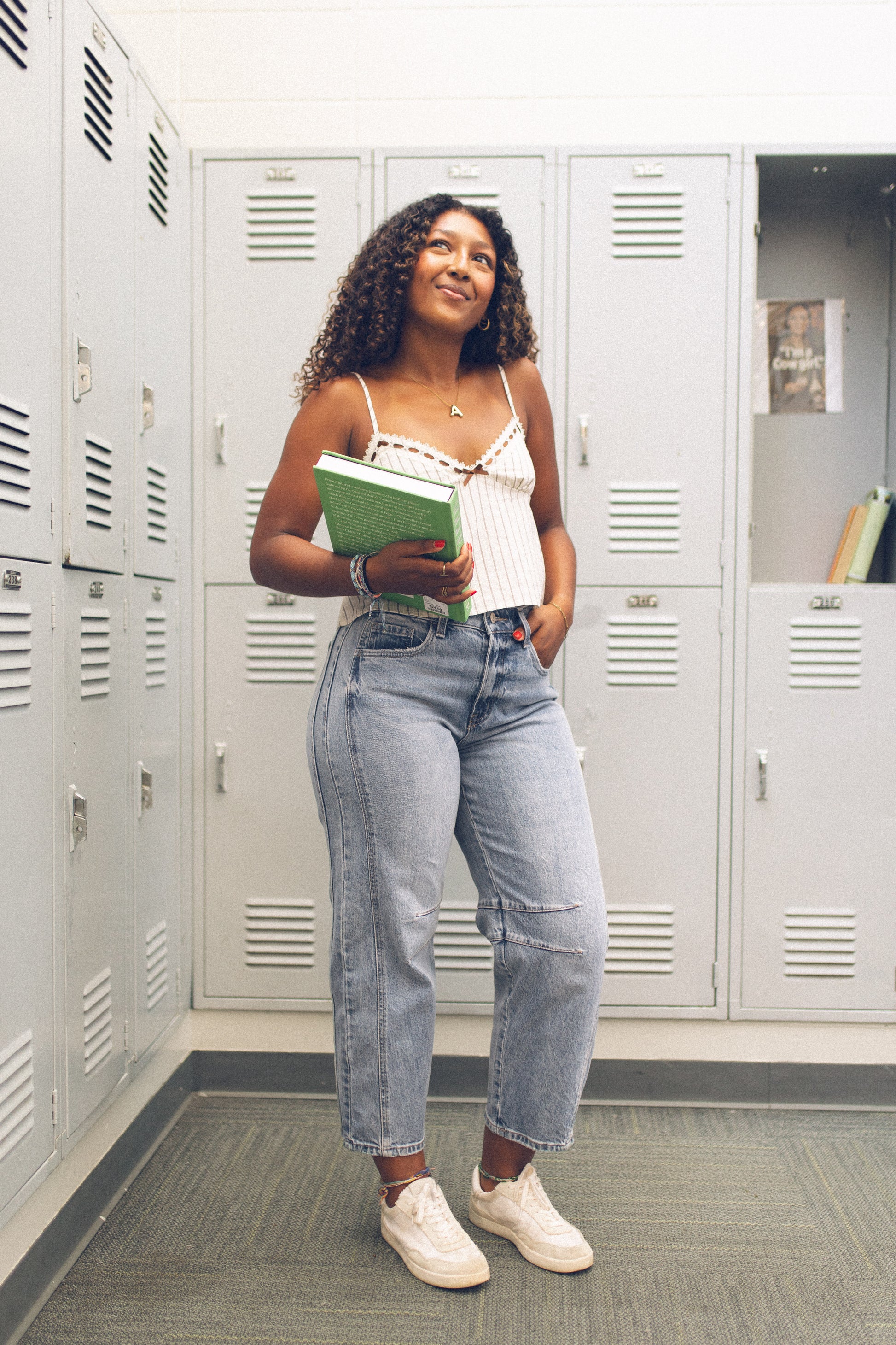 Comfort stretch denim, high rise waist, seam stitching detail on inseam