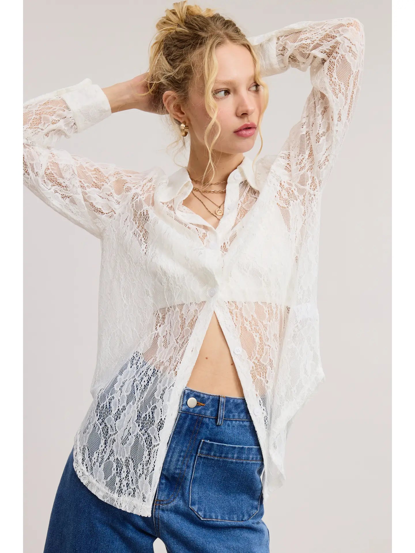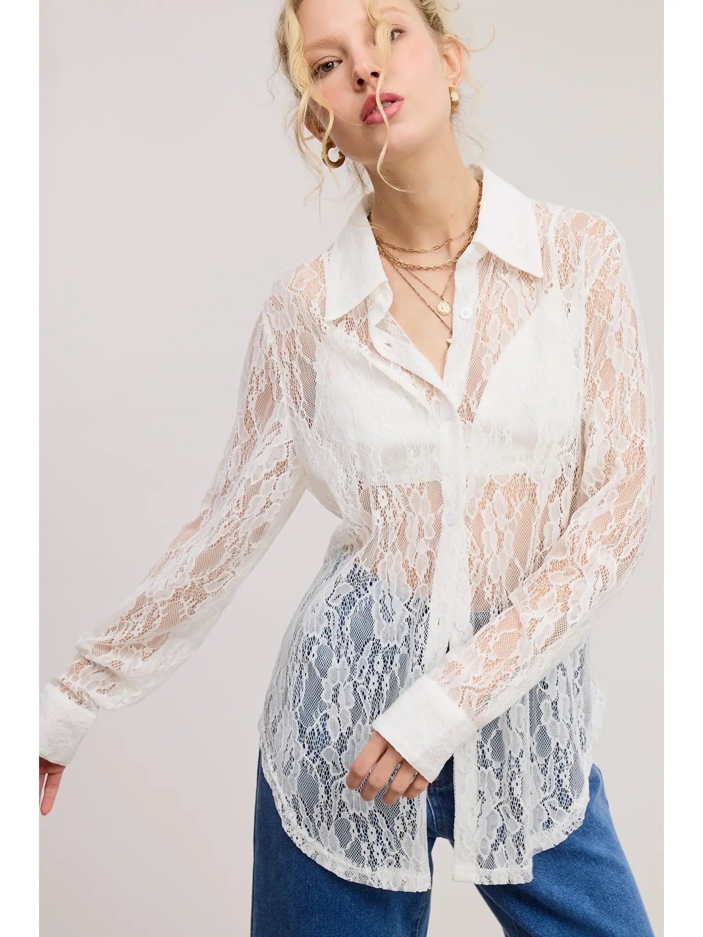 Long sleeve, button up, sheer lace, shirt tail hem, collar is solid
