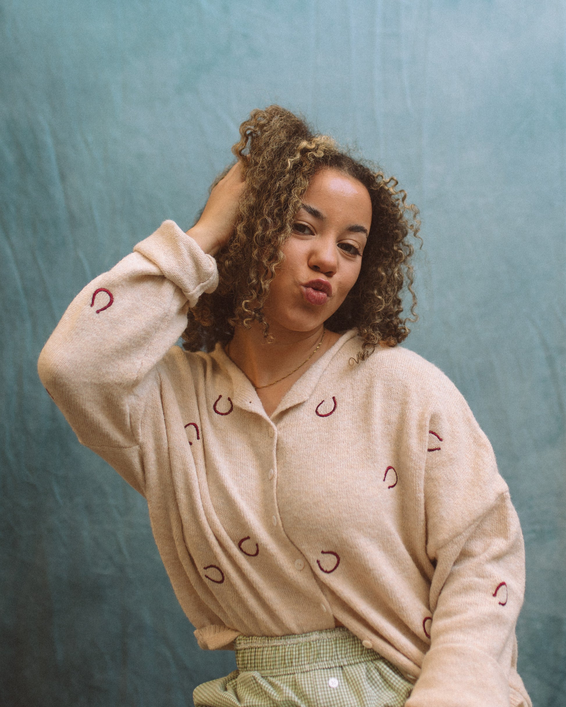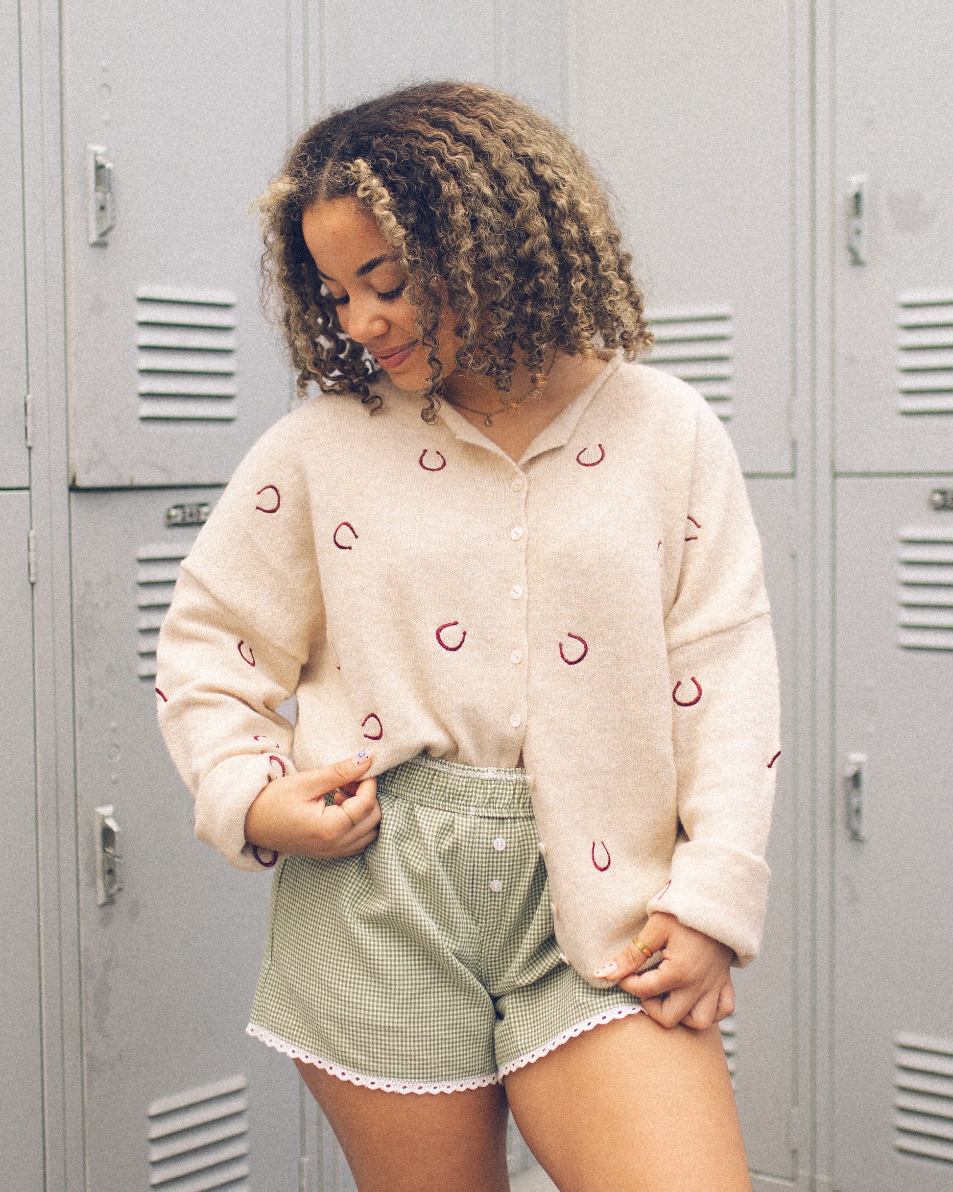 Button front closure, color is light tan with embroidered maroon horse shoes
