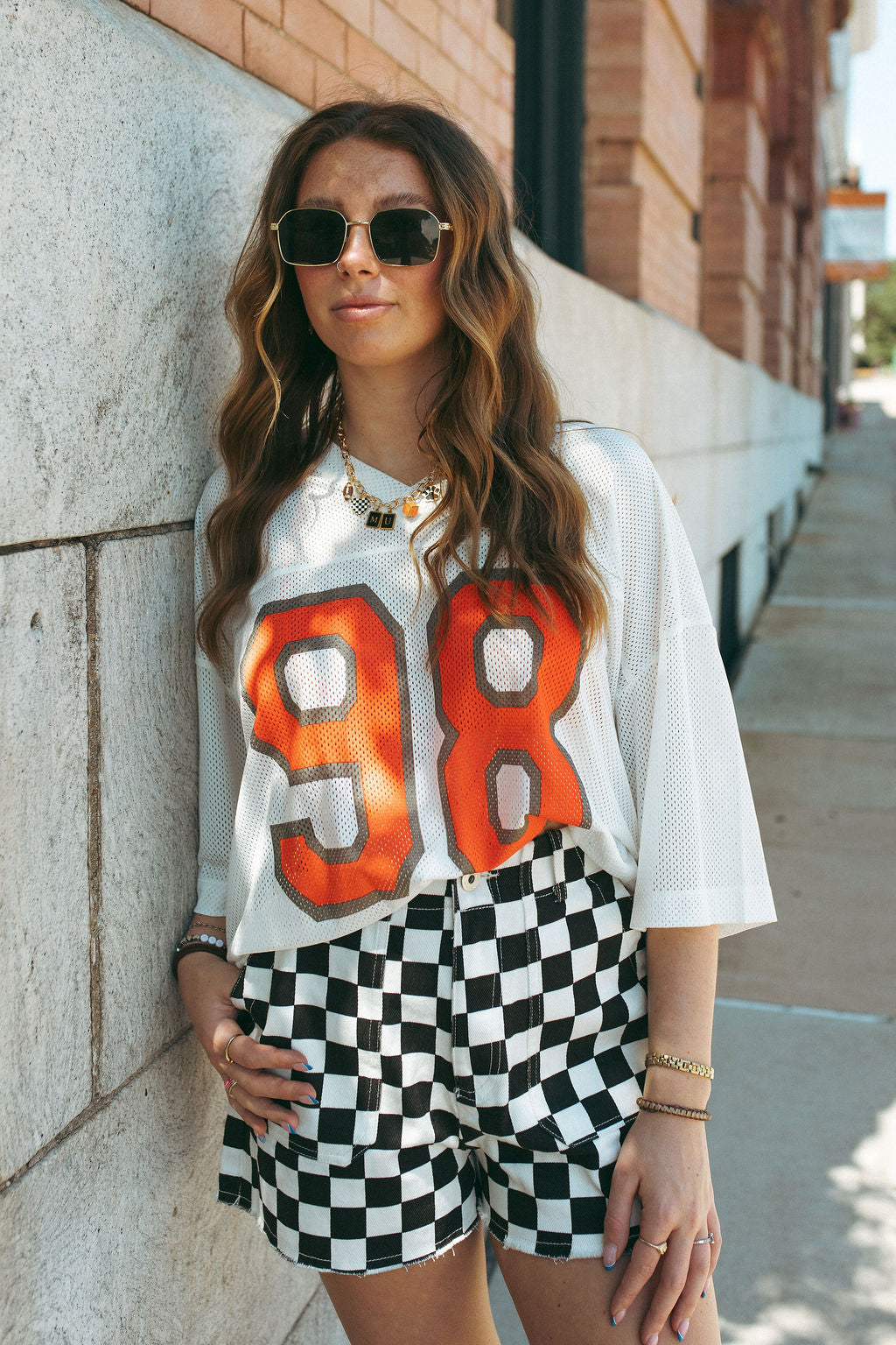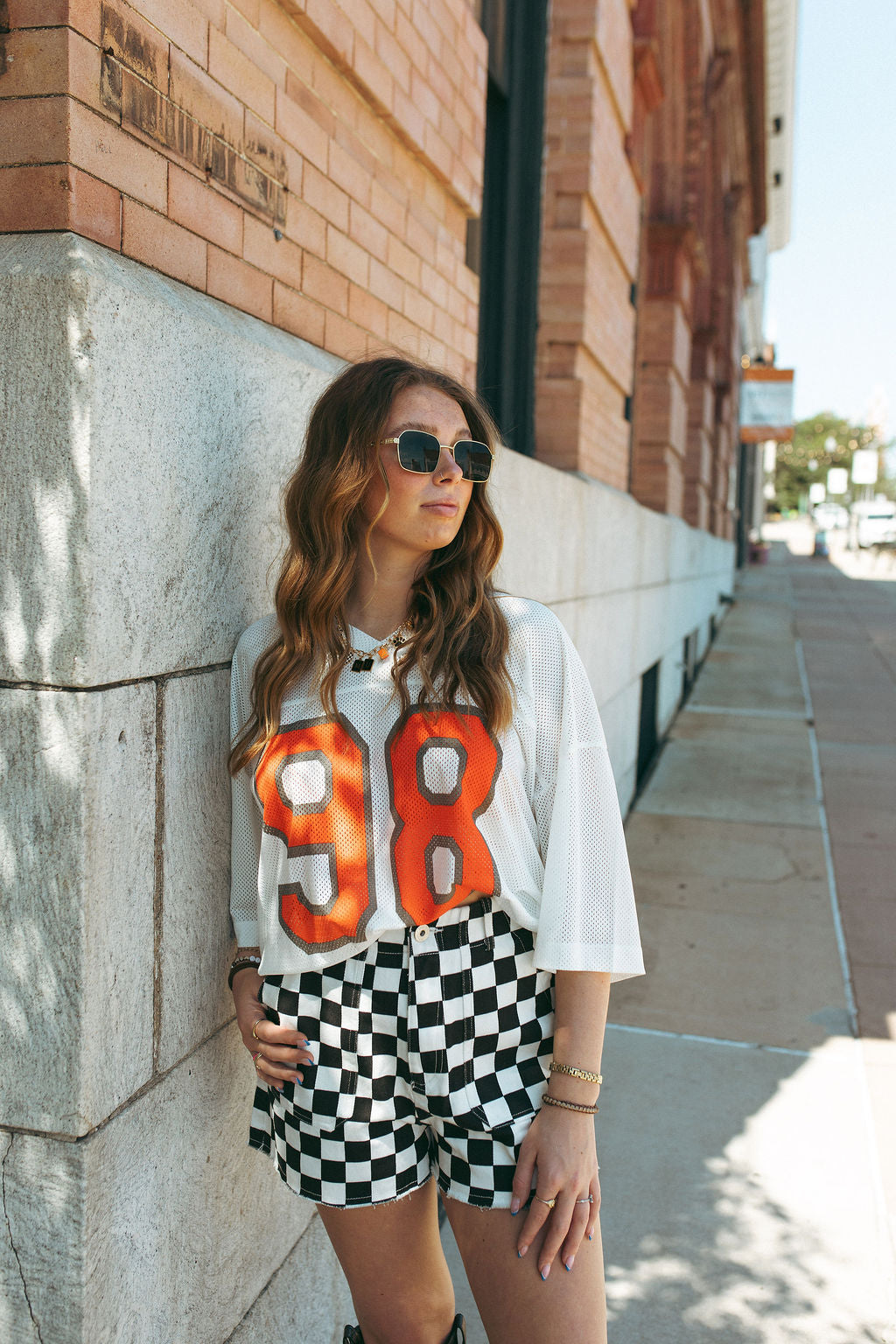 V-neck, mesh, short sleeve, orange 98 with grey trip